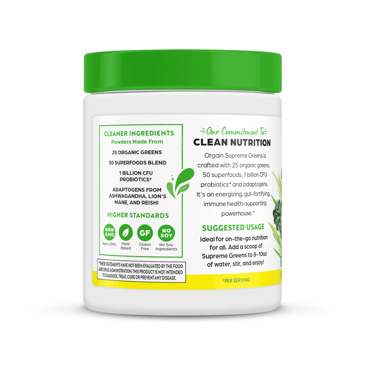Our Organic Lemon Twist Flavored Supreme Greens Superfood Nutrition Powder is a smart and convenient way to supercharge your everyday nutrition and support gut health ++. Each serving contains 25 Organic Greens including purslane, kale, spinach, broccoli, chlorella, and more, and 50 organic, vegan superfoods. Our Supreme Greens Superfoods powder is certified organic, so you can rest assured that you are getting good, clean nutrition. Plus, each scoop contains 1 billion probiotics to support your digestive health++ and adaptogens ashwagandha, reishi, and lion’s mane!